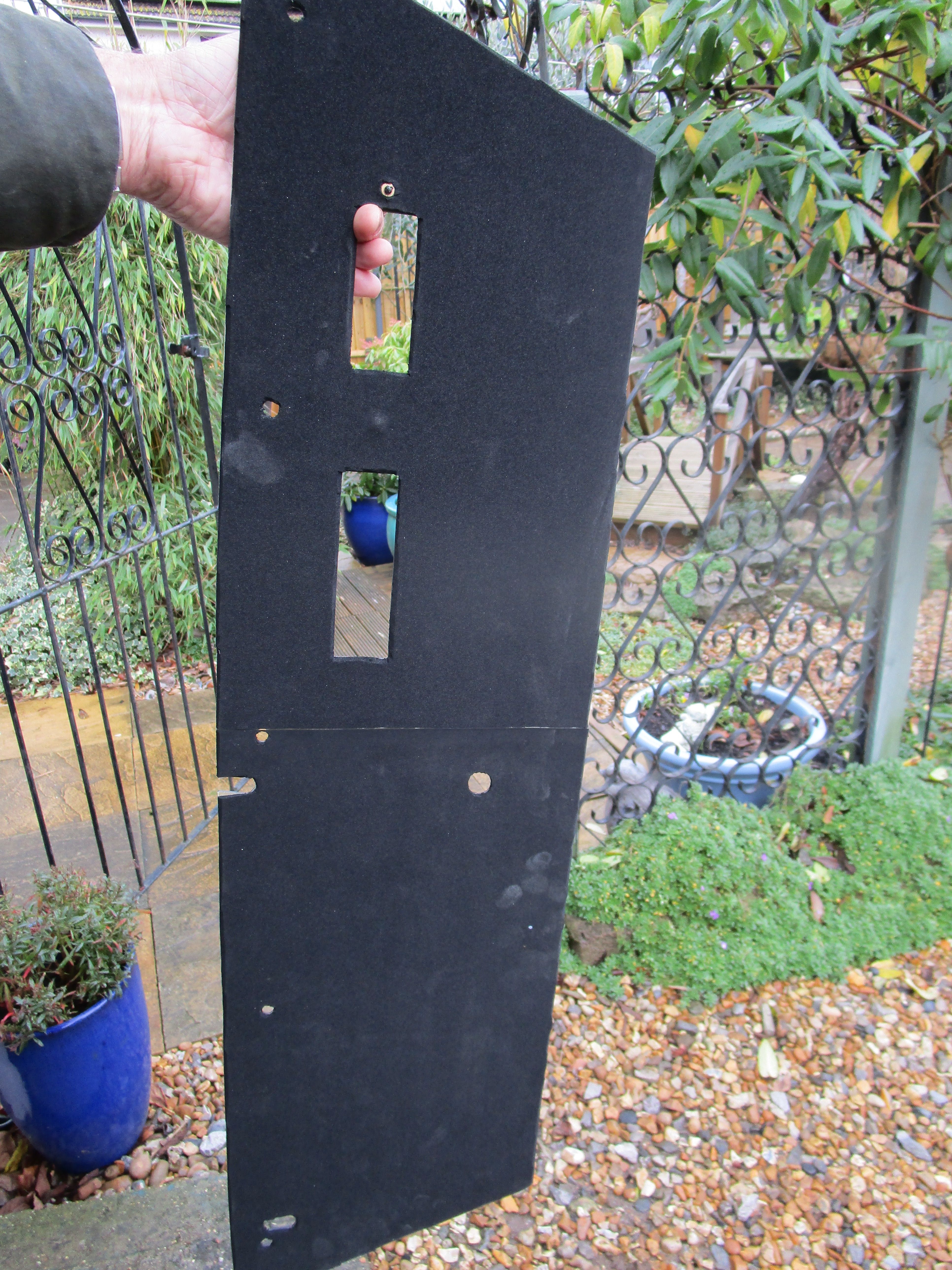 For the fuel tank boot base i put strips of fireproof foam in the slots and cut down an Imp rear shelf matt so it goes almost to the bulkhead . the fibreglass back borad when fitted keeps it from moving .
