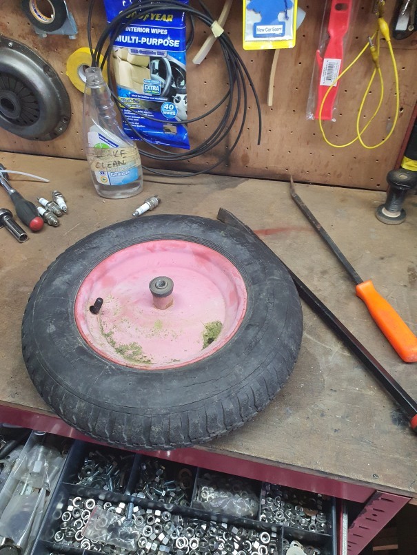 While you're on wheels , here's one bought in for me to modify this week , boy is it heavy , made mostly of wood , brake drum held on with coach bolts , 30" diameter.