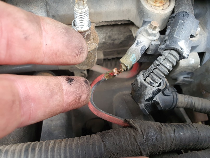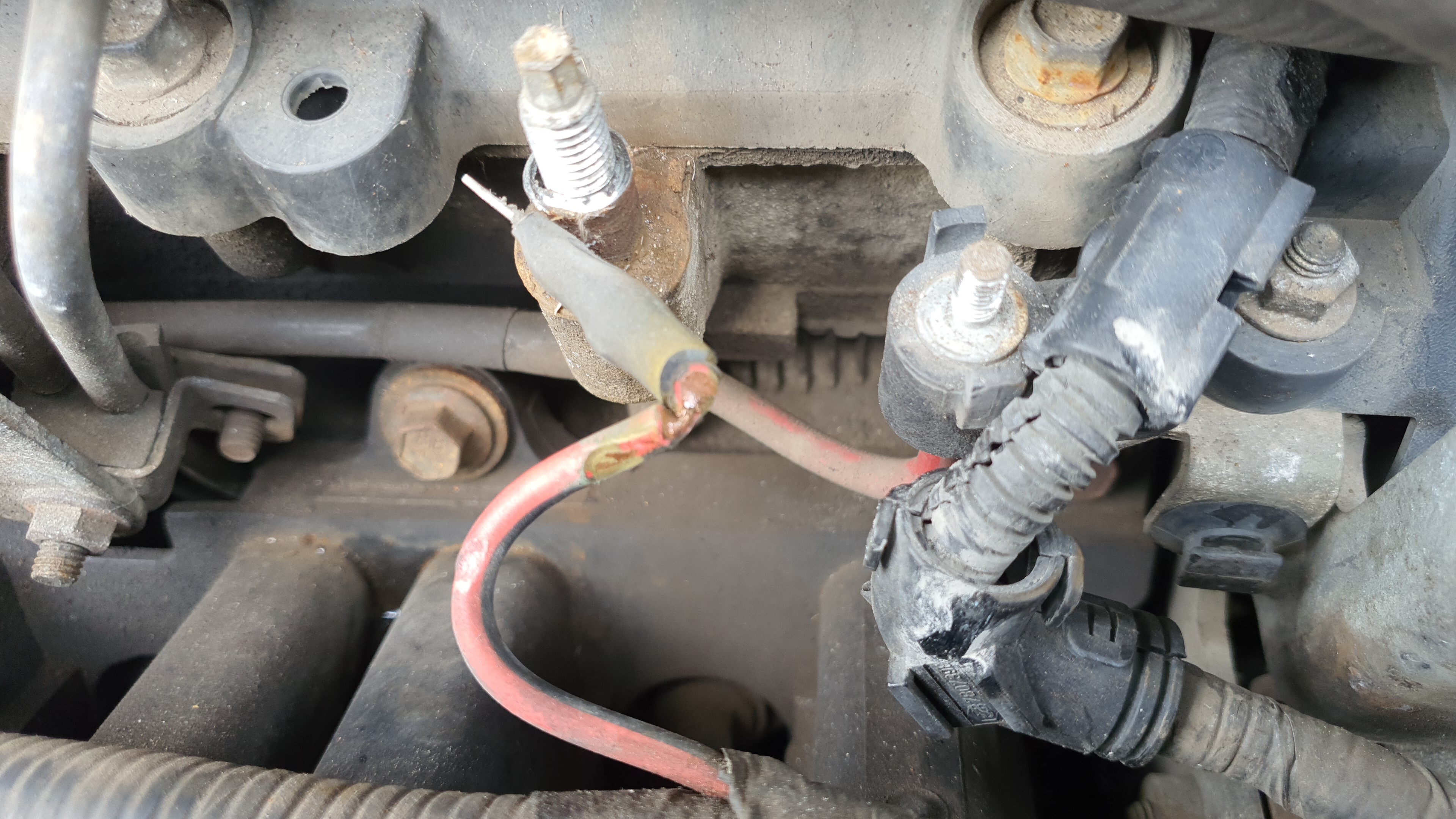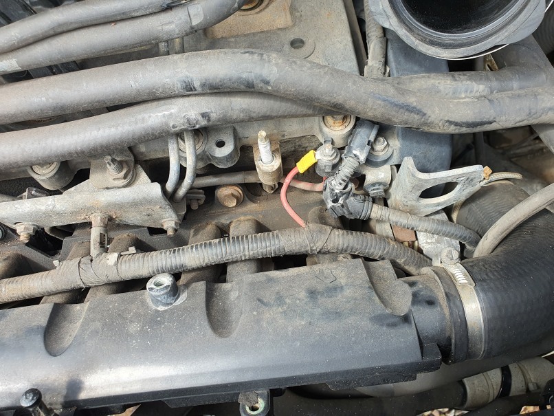 What lies beneath, wondered why the cold start was sometimes iffy, never let us down but here was teh supply for the heater plugs reduces from 30 strand to 3 by looks of it, surprised it never melted, clean worn through as the air box must have been rattling on it for ages with no bushes.