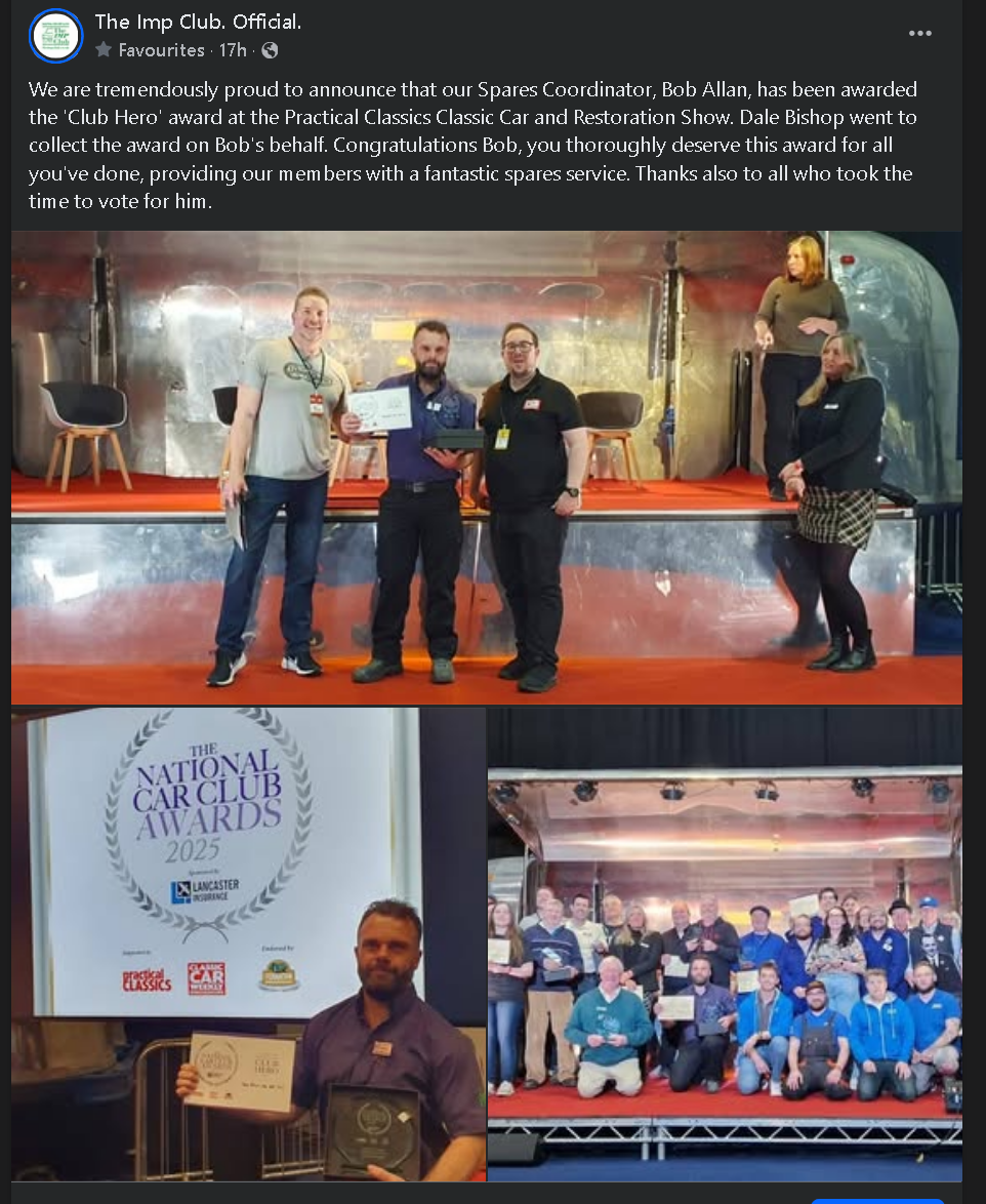 Bob Allan Imp Club Spares Co-Ordinator wins Club hero Award at NEC Restoration Show