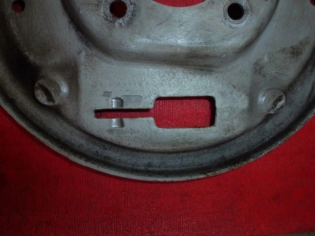 This back plate has damage where the handbrake mechanism fits this stops the slave cylinder from sliding properly. The damage to the shoe edge support pads either prevents the shoes from contacting drum fully or the edge of the shoe lips over the ridge and lightly contacts the drum heating the shoe material up and causing a glazed high spot that makes that section of the material useless. You can lose 50% of your braking effort with these problems
