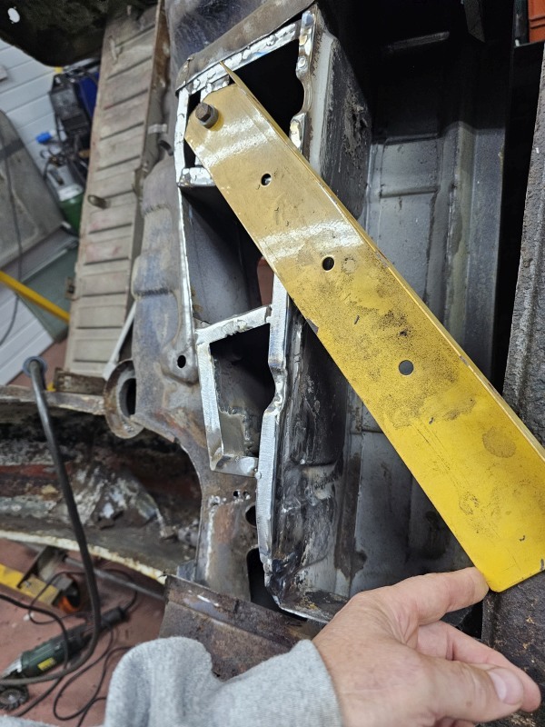 Some snippets of the home made "aligment" tool to make sure the box section surfaces were all falt, a short section of flange bolted to a known good cross member fixing and slid back and forth like a pendulum