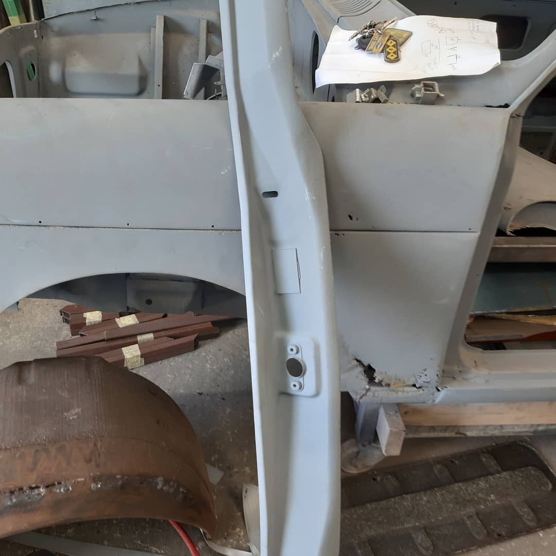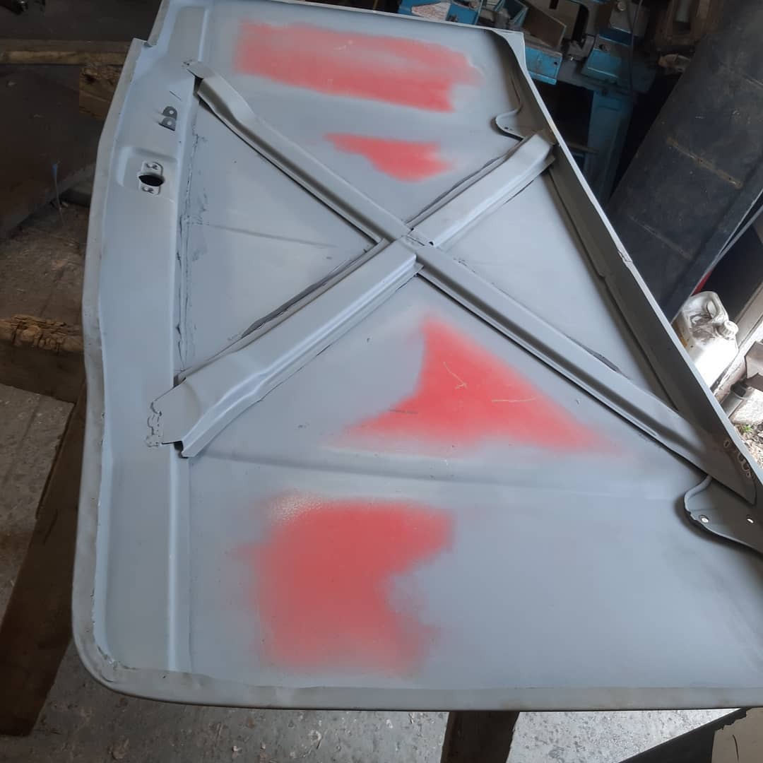 Bought this bonnet a few weeks ago with a nice big dent in the nose . I decided to take it apart 1 evening and had it sand blasted . Turned out to be in good condition so I welded it back up yesterday evening and glued the frame back in . I realized that the X was put in pissed originally so I put it back on the same spot welds this 1 is destined for Graham Traxson #imp