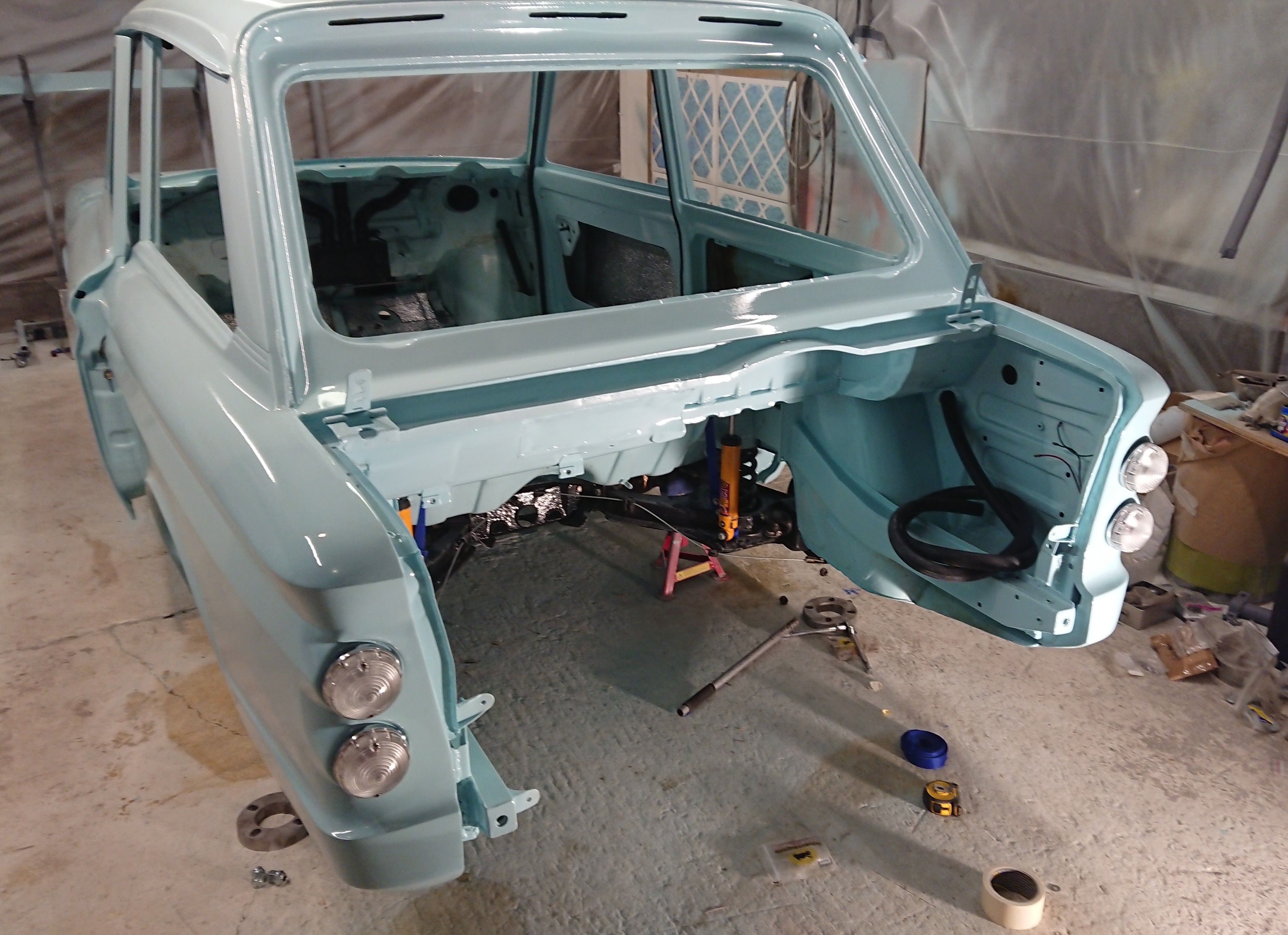 So tonight the headlamps went in along with the fuel tank framework, tool tray and I made up check straps for the front suspension to prevent the springs falling out of place.