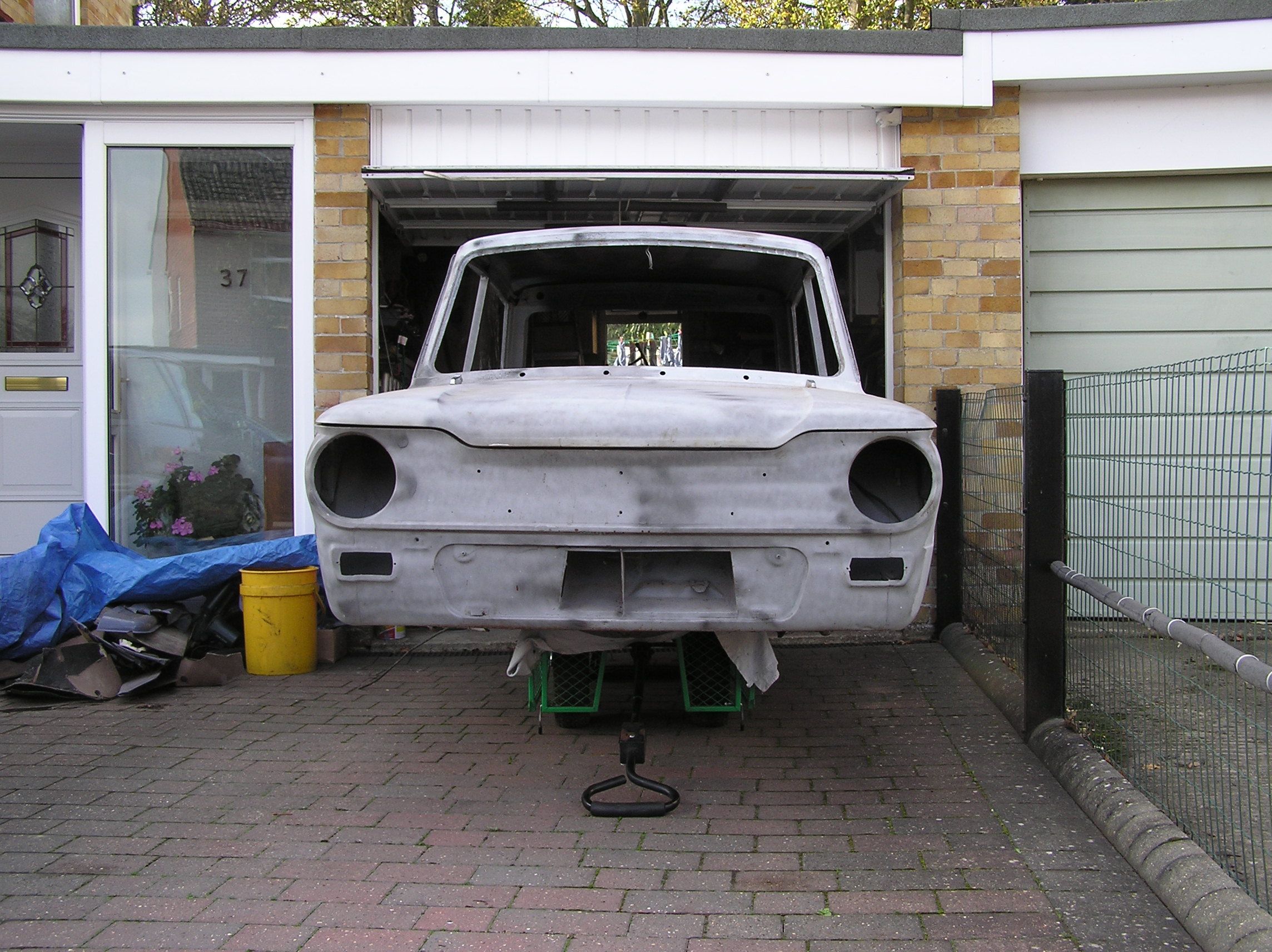 Little did she know l had been looking on ebay for a suitable buy, l had not given this one too much thought as it was lying a bare shell in primer on its side in a garage my thinking at the time was, TOO much work, having thought about it for a few days i realised that a bare shell lets you completely view almost all of the shell which is a good point to start , it was only 50 miles away so went to view it ,all seemed fine, l awaited final few seconds before end of auction and bid £1200 to make sure that l got it , so l bought the shell and virtually two cars worth of bits for £620 .